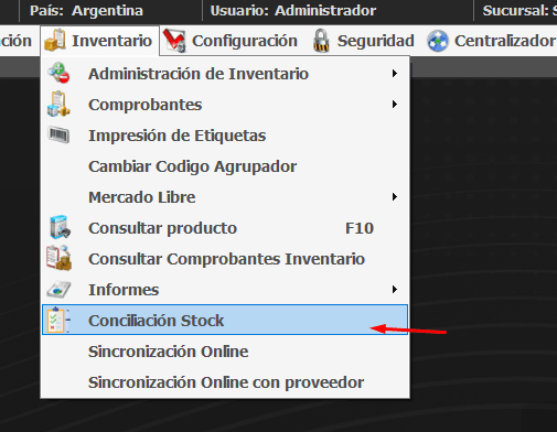 Para acceder al modulo de Conciliacion de stock debemos ir a Inventario -> Conciliacion Stock.