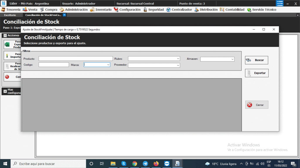 En almacen selecciona la sucursal de la cual desea controlar el stock. Presiona en el botón Buscar y se cargaran los productos en la parte de abajo. Con los datos de cada producto. Presionamos Exportar para generar el Excel. La planilla generada cuenta con una columna con el nombre Recuento la cual debe ser llenada con el stock real con el que cuenta
