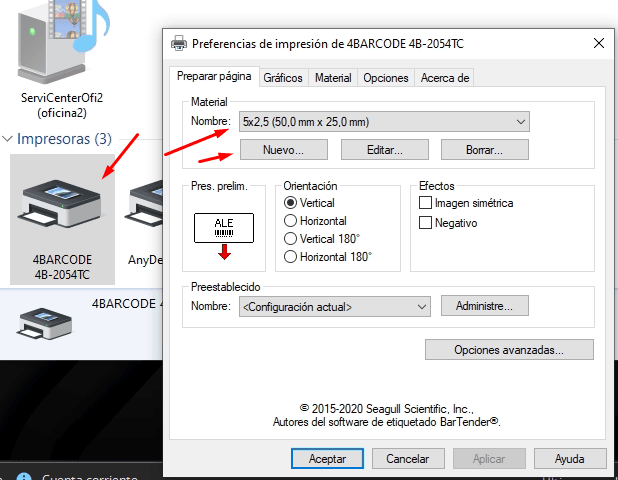 Si la impresora del cliente es 4BARCODE 4B-2054TC, debemos configurar la impresión de etiquetas de la siguiente manera: