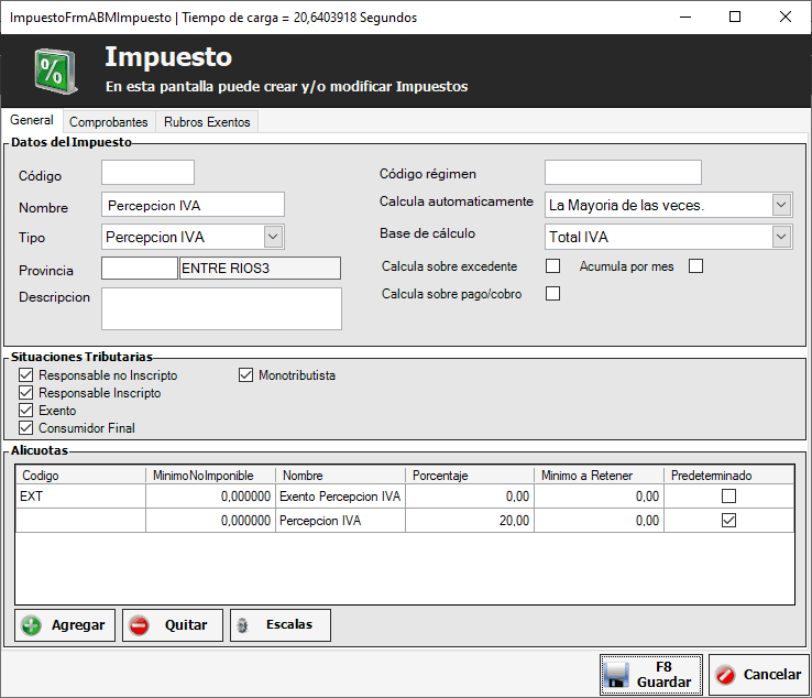 El impuesto tiene una grilla con alícuotas, el impuesto se calculará con la alícuota predeterminada.