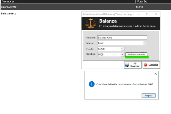 - Luego le damos al botón Nuevo para crear y, si sabemos los datos de la balanza la configuramos asignándole el nombre, la marca un puerto, y los baudios correspondientes, luego dar clic en Probar conexión para corroborar que la balanza este conectada y funcionando.