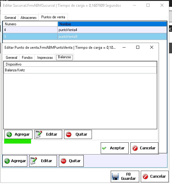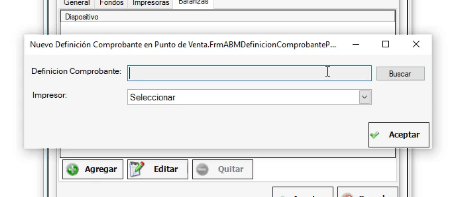 - Si todo funcionó correctamente, nos dirigimos al menú Seguridad -> Sucursales y le damos a Editar luego hacemos clic en la solapa Puntos de venta, seleccionamos el punto de venta en que queremos la asignación la balanza, le damos a Agregar y agregamos la balanza con los comprobantes deseados en dicho punto de venta.