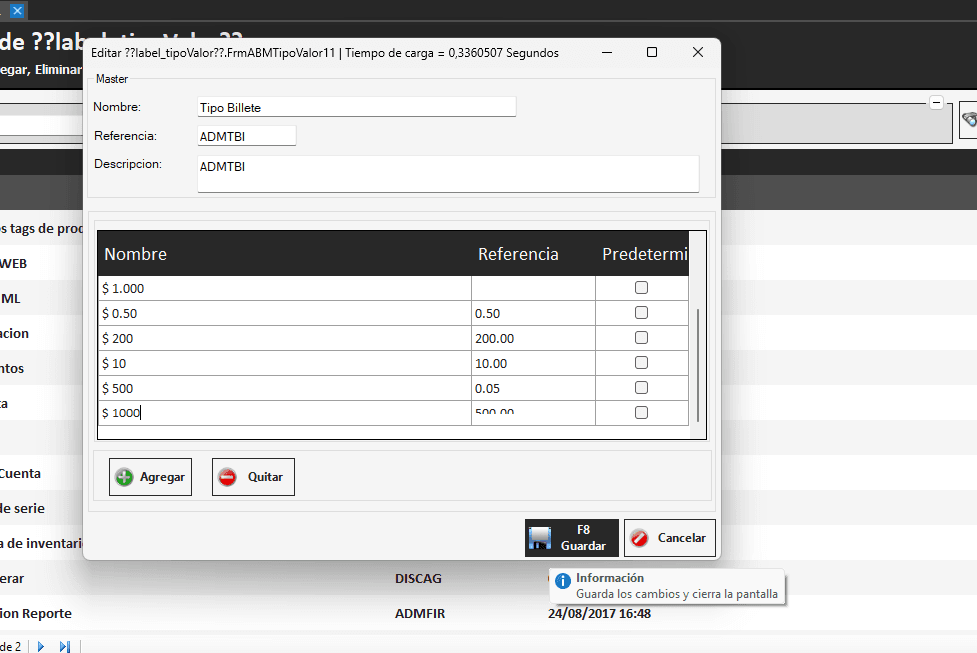 - Luego, que hayamos quitado los billetes que el cliente no quiera, presionamos en el botón AGREGAR para agregar los billetes que solicita el cliente. Por ejemplo: billetes de $1000