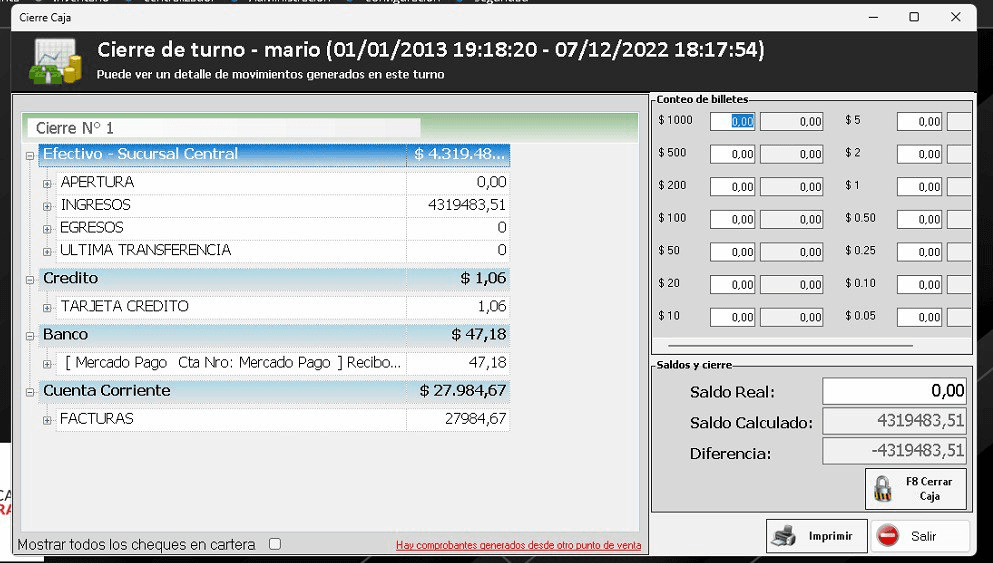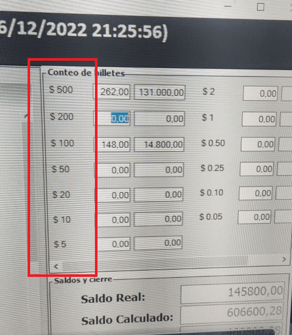 Sí nos dirigimos al Cierre de Caja vemos reflejado los billetes, en este caso, agregamos el billete de $1000.
