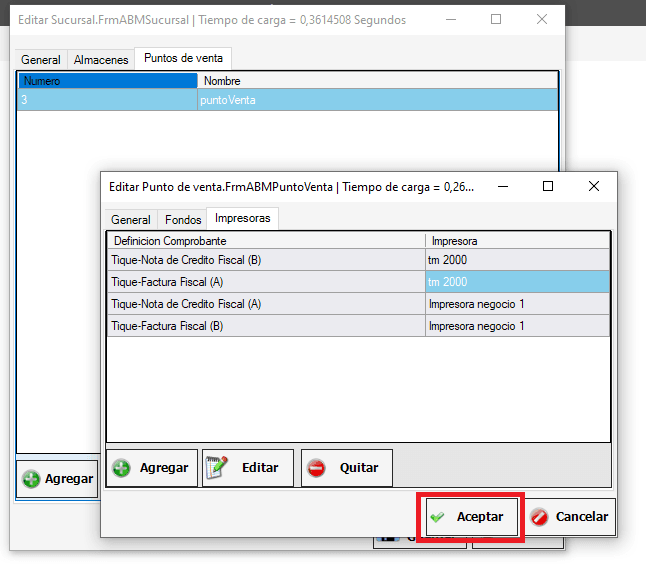 Seguridad —-> Sucursal —-> Sucursal Central —-> Editar —–> Y en la Solapa Punto de Venta; agregamos cada definición y su Impresora.