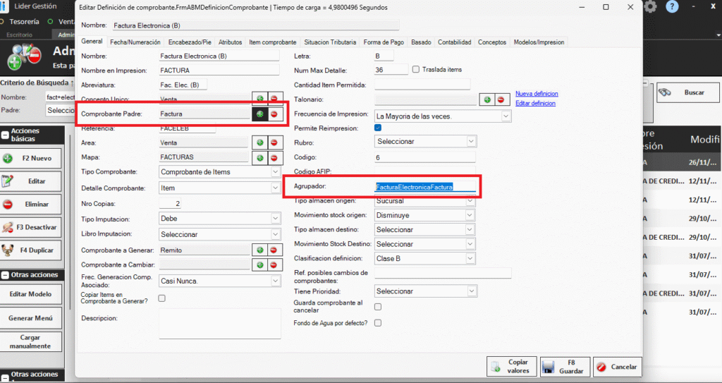 - Configuración – tipo de comprobante – facturación electrónica. Una vez que estemos en esa pantalla debemos copiar el agrupador de la factura y el concepto padre de la factura.