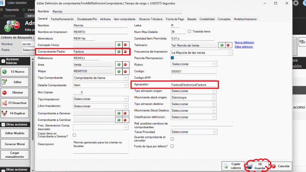 Luego, nos dirigimos al modelo de remitos y en el campo Agrupador lo configuramos tal cual está en la factura electrónica, quedando de este modo: