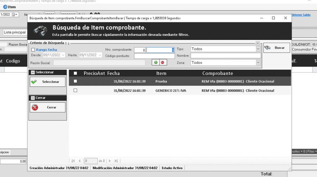 Una vez que lo configuremos el ítem de comprobante en el basado se muestra de la siguiente manera en el sistema: