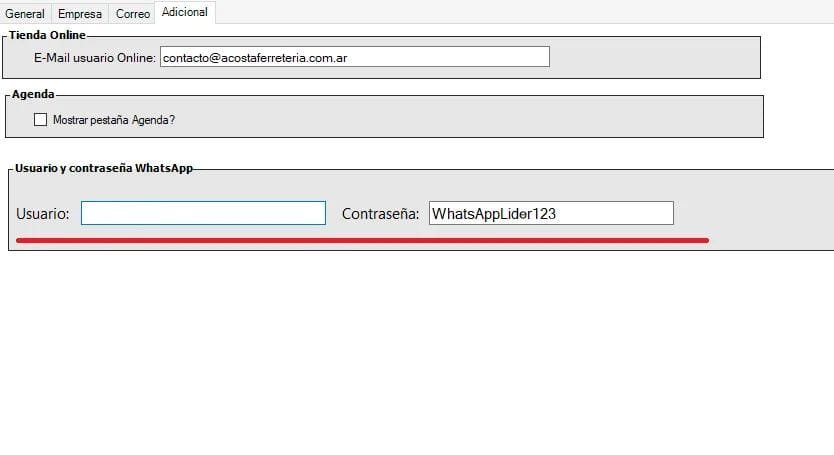 Configuración – Empresa y desde la solapa ADICIONAL agregamos el usuario y contraseña del cliente