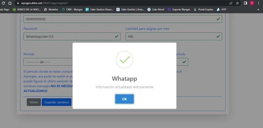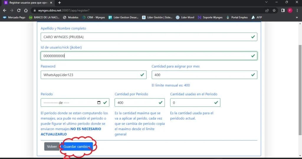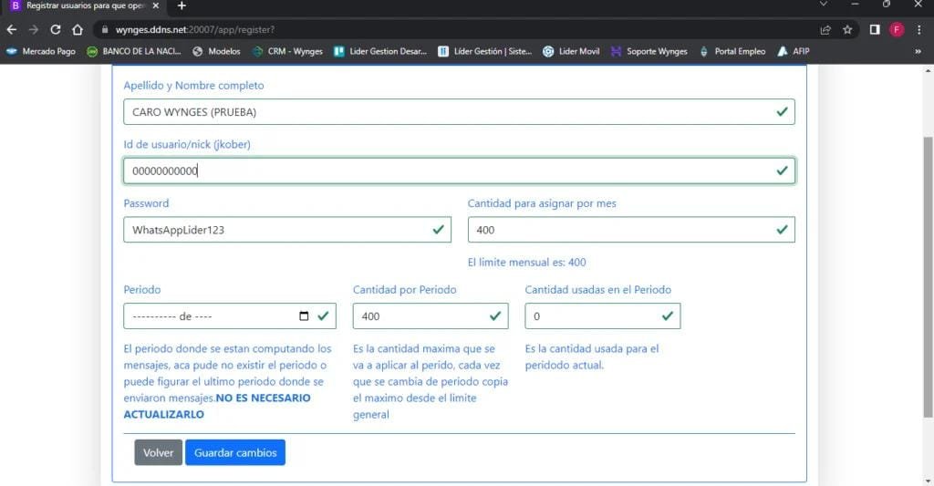 Completando los datos requeridos. Y ES SUMAMENTE IMPORTANTE QUE EL USUARIO, CONTRASEÑA Y NOMBRE DEL CLIENTE (avisar a flor para que guarde los datos) . La contraseña va hacer la misma para todos los usuarios WhatsAppLider123 y en «Cantidad para asignar por mes» son los mensajes que adquirió por mes el cliente (esto consultar a Caro) para saber cuánto adquirió el cliente.