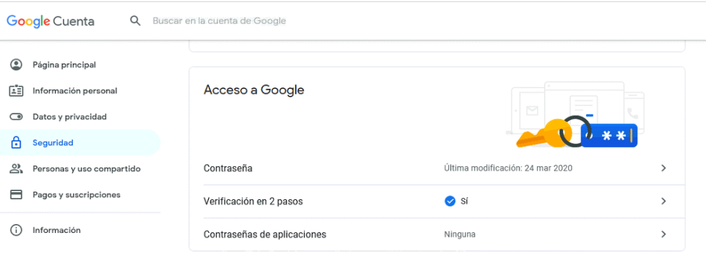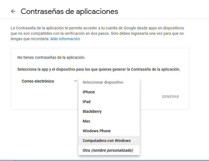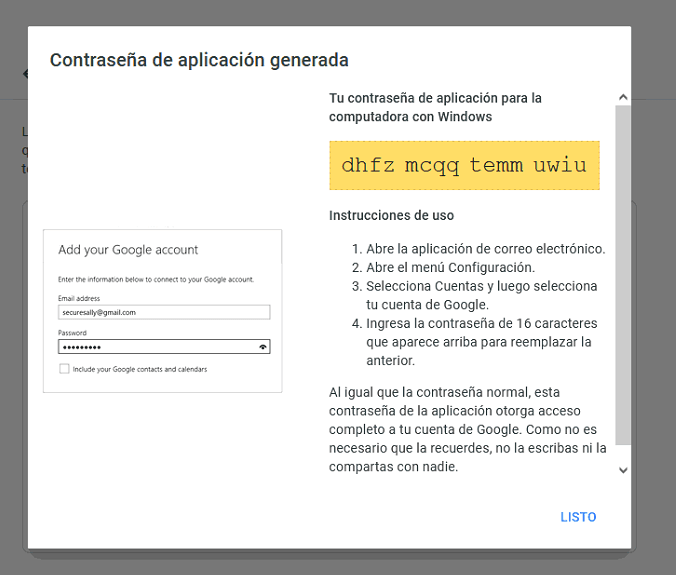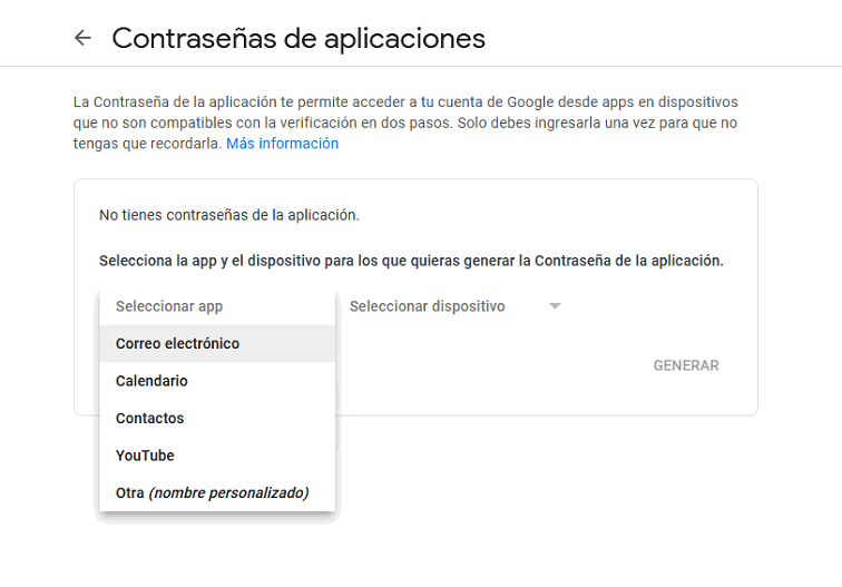Cuando ocurre esto debemos ir a https://myaccount.google.com/security? (logueándonos en la cuenta que queremos asociar al sistema), seleccionar el apartado Seguridad, Acceso a Google y Contraseña de aplicaciones