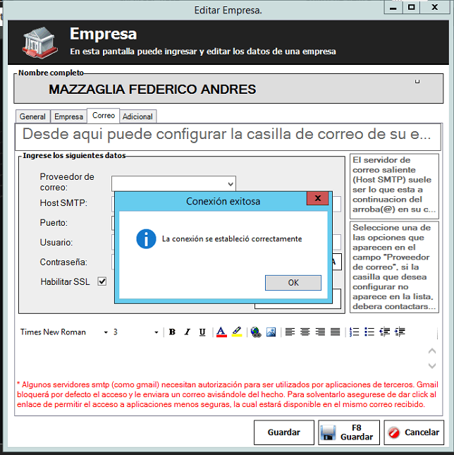 Luego la pegamos en la contraseña del correo en Editar empresa y le damos a Probar conexión y listo