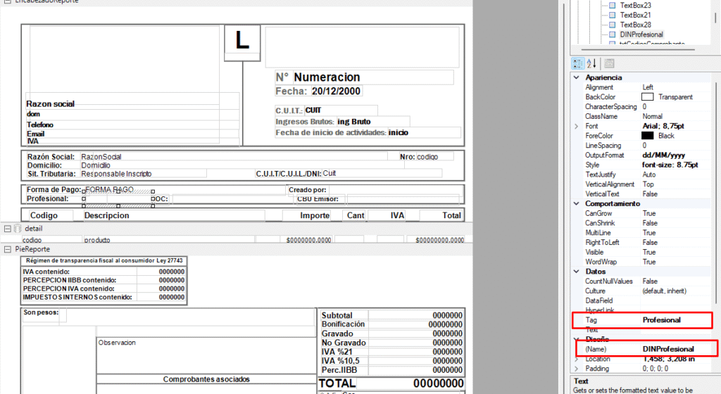 Este procedimiento aplica para cualquier campo que necesitemos agregar y que no figure en el modelo de impresión. Es importante recordar agregar el nombre del campo de forma correcta. En este caso, utilizamos «Profesional» porque el cliente solicitó ese campo específico. Si se desea agregar otro campo, siempre se debe usar DIN seguido del nombre exacto del campo que se quiere agregar, y en el TAG, agregar seguido del nombre exacto del campo.