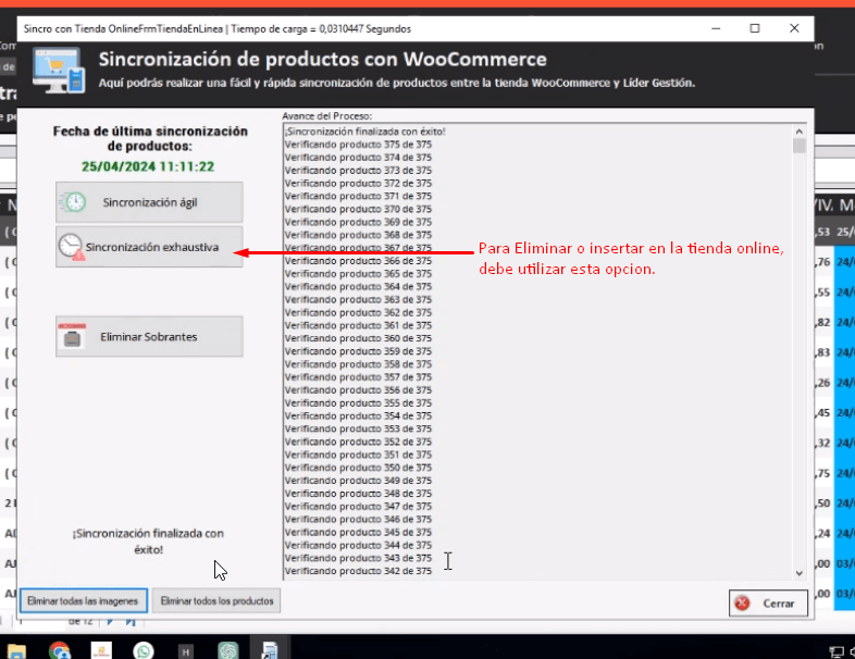 Cuando desactivamos productos en el sistema y para que no aparezcan en la tienda WooCommerce, debemos presionar el siguiente botón a la hora de sincronizar: