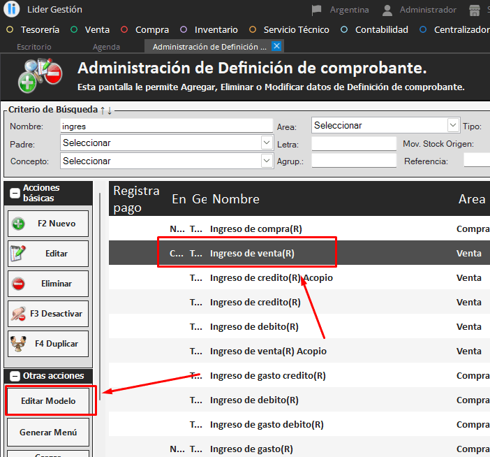 Desde Configuración – Tipo de comprobante – elegimos el comprobante en cuestión y editamos el modelo.