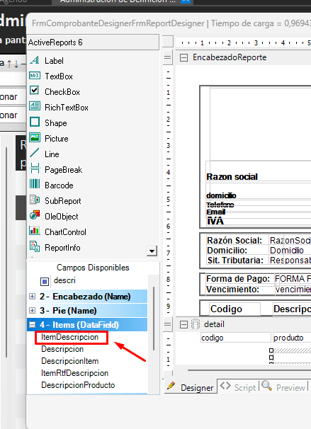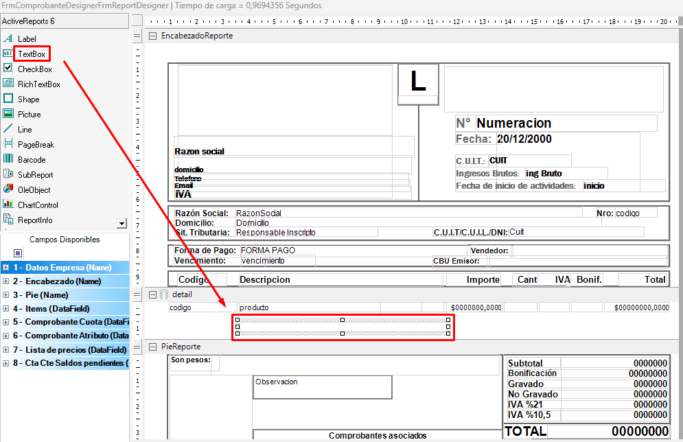 Ya dentro del comprobante agregamos un Tex Box justo por debajo del nombre del producto (descripción).