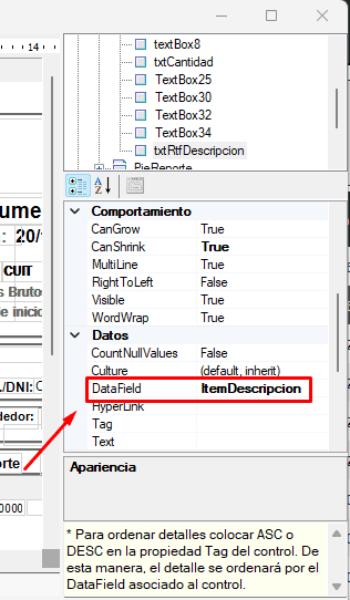 En ese Tex Box agregamos la propiedad ItemDescripcion.