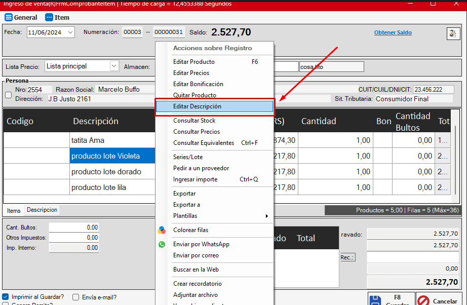 En la pantalla de facturación hacemos clic derecho sobre el ítem al cual queremos agregar la descripción y seleccionamos el botón Editar Producto.