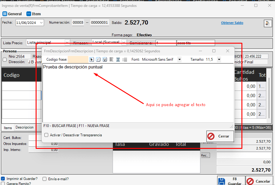 Éste es el procedimiento mediante el cual se puede agregar una descripción por cada uno de las ítems que componen un comprobante.