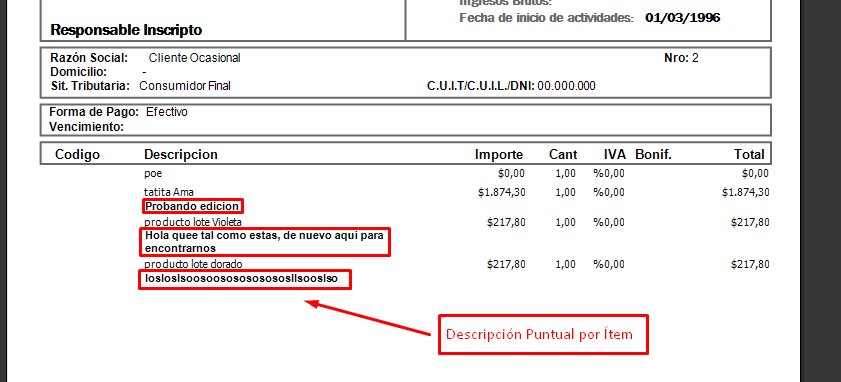 A continuación se muestra un ejemplo de como queda reflejada en el comprobante la descripción puntual por producto.