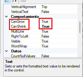 Importante: La propiedades Can Grow y Can Shrink deberán estar en True para que el texto ingresado pueda expandirse y achicarse según lo necesario.