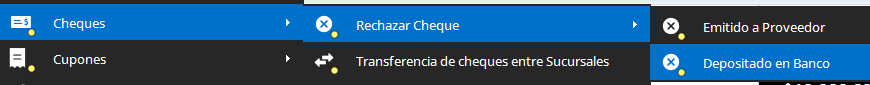 Nos dirigimos a «Tesorería → Cheques → Rechazar cheque», y seleccionamos, de haber sido depositado el cheque, en este caso, «depositado en banco«