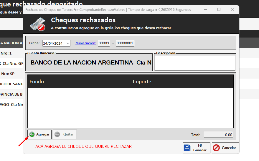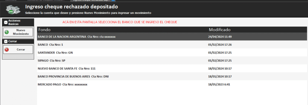 Luego, en la siguiente pantalla seleccionamos el banco al que fue cargado el cheque que queremos rechazar y presionamos en NUEVO MOVIMIENTO