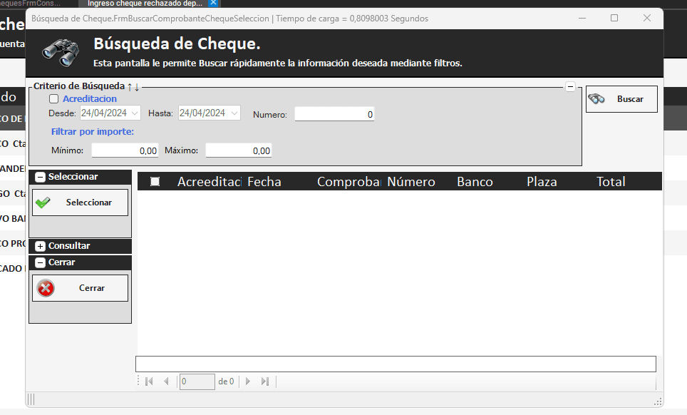 Luego, buscamos el número del cheque y presionamos en SELECCIONAR