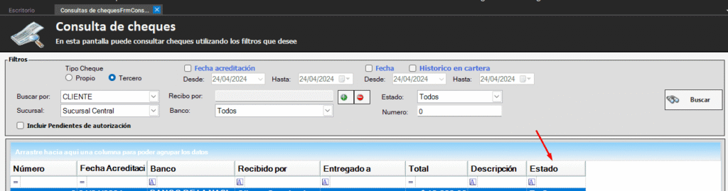 Y si nos dirigimos a «Tesorería → Cheque → Consulta de Cheques», puede ver reflejado que ese cheque esta como ESTADO RECHAZADO.
