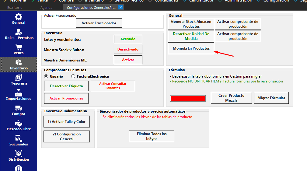 Configuración – Activación de funciones y desde la solapa INVENTARIO activamos el botón:
