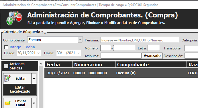 Datos como la Fecha, numeración, situación tributaria, tipo de identificación, CUIT y más se pueden modificar yendo a Compra -> Consultar comprobante de compra, seleccionar el correspondiente, pinchar el triángulo invertido pegado al botón Editar y darle a Editar encabezado