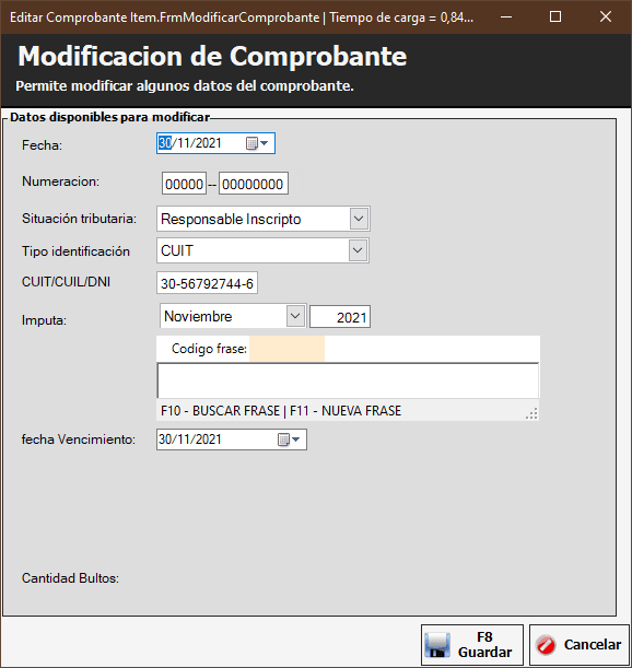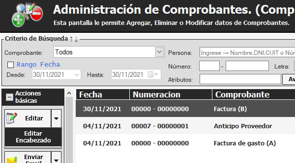 Desde Consultar Comprobantes de compra puede buscar el comprobante y, pegado al botón hay un triángulo al revés que le da la opción de editar encabezado. Una vez dentro se le puede modificar fecha, numeración, situación tributaria, tipo identificación, CUIT, DNI y más. Al terminar le damos a Guardar y listo