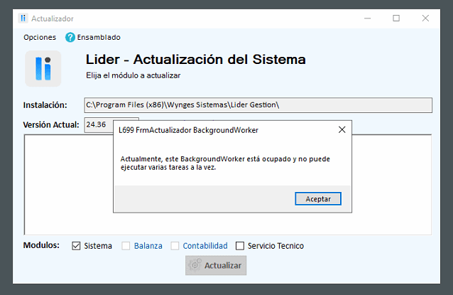 Si al intentar actualizar a la última versión de Líder no se encuentran nuevas versiones o nos sale este mensaje en pantalla seguramente se deba a que estamos ejecutando una versión vieja de la herramienta actualizador.