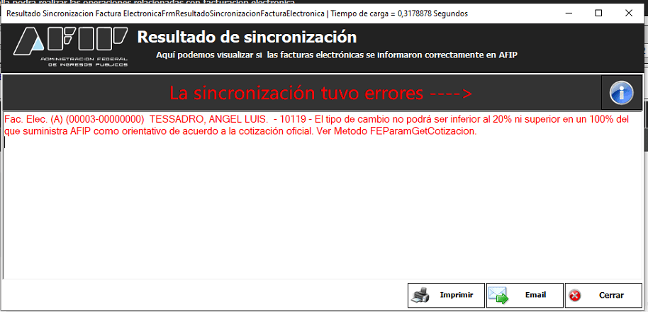 Si el cliente al querer sincronizar la factura con AFIP le arroja ese error es porque esta ingresando mal el precio del dólar para hacer la cotización, es decir, no puede poner una tasa de cambio menor al 20% o mayor al 100% de los precios de AFIP. Por ejemplo: si el dólar está a 100 pesos la cotización no puede ser menor a 80 pesos o mayor a 200.