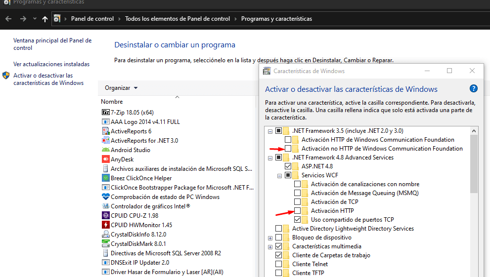 Cuando ocurre esto suele ser por no tener instalado .NET Framework 4.8.*. Podemos hacerlo desde el instalador del sistema, desde el sitio web de Microsoft, desde las actualizaciones de Windows ó desde las Características de Windows como en la siguiente imagen