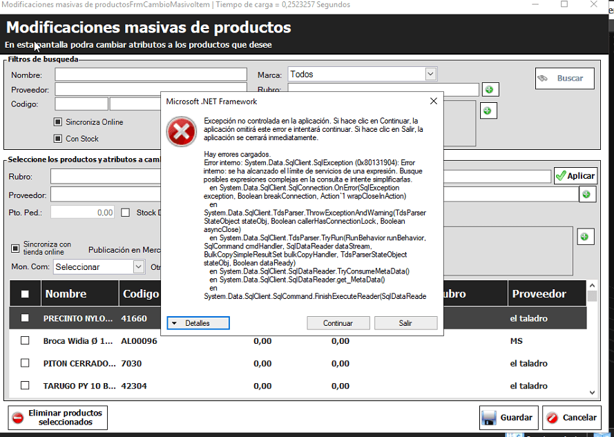 Cuando ocurre esto es porque la consulta encuentra muchos productos, probablemente más de 15.000. En este caso el sistema no puede manejar tal magnitud y genera la excepción mostrada. En este caso se puede reducir la misma buscando por proveedor, marca o rubro