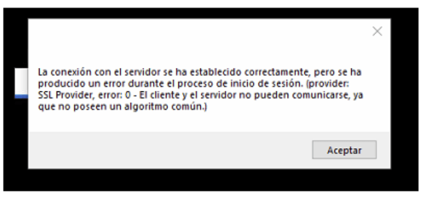 Error al ejecutar el sistema: "La conexión con el servidor se ha establecido correctamente, pero se ha producido un error durante el proceso de inicio de sesión. (provider: SSL Provider, error 0 - El cliente y el servidor no pueden comunicarse, ya que no poseen un algoritmo común)"
