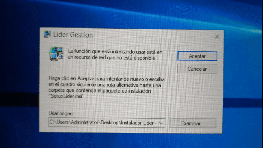 «No se pudo encontrar la ruta de acceso «C:UsersAdministratorDesktopInstalador Lider – Version 24.07SetupLider.msi». COmpruebe si dispone de acceso a esta ubicación y vuelva a intentarlo, o bien, intente buscar el paquete de instación «SetupLider.msi» en una carpeta desde la que pueda instalar el producto Lider Gestion.»
