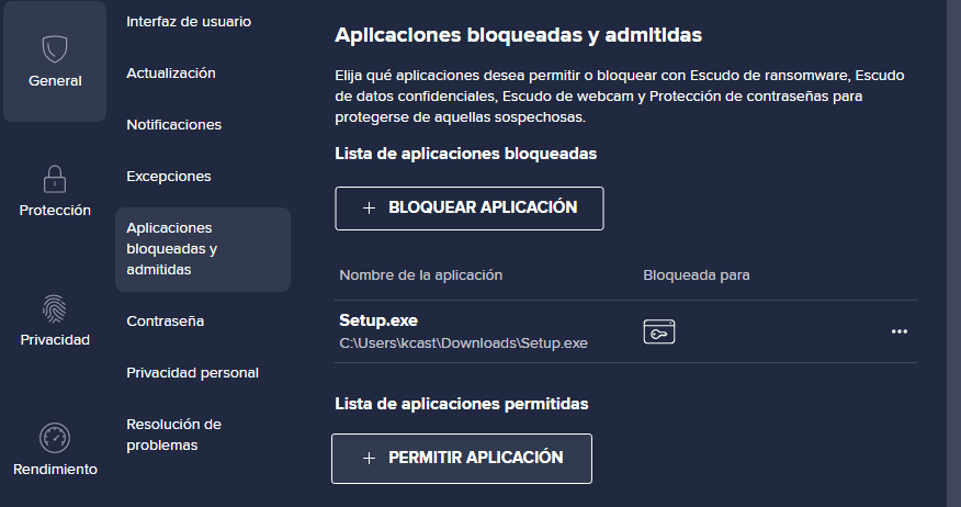 Por último vamos a General -> Aplicaciones bloqueadas y admitidas, y le damos al botón PERMITIR APLICACIÓN. Pinchamos el botón SELECCIONAR RUTA DE LA APLICACIÓN, buscamos la carpeta de instalador de Líder y seleccionamos el ejecutable de Líder