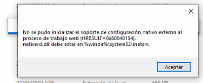 No se pudo inicializar el soporte de configuración nativo externo al proceso de trbajo web (HRESULT=0x80040154). nativerd.dll debe estar en %windir%system32inetsrv.