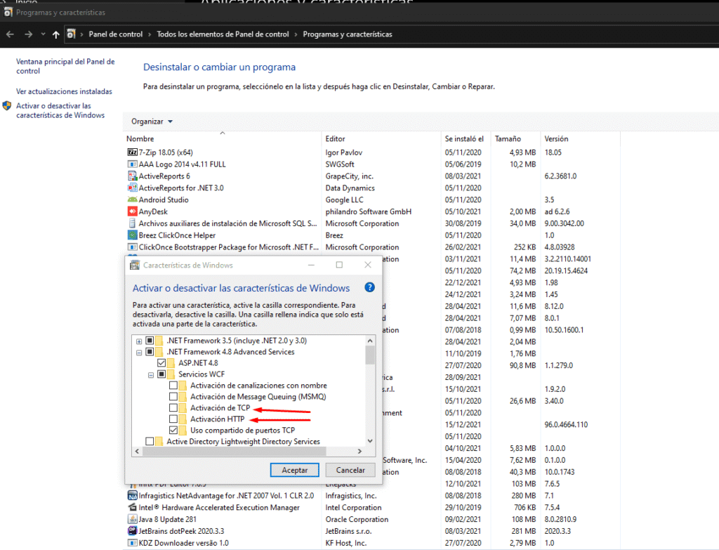Hay que ir a Características de Windows y activar los servicios que se encuentran en .NET Framework 4.8 Advanced Services -> Servicios WCF, llamados Activación de TCP y Activación HTTP. Dale a aceptar e iniciar el sistema