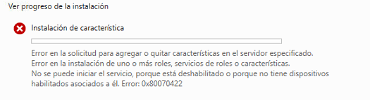 Error en la solicitud para agregar o quitar características en el servidor especificado. Error en la instalación de uno o más roles, servicios de roles o características. No se puede iniciar el servicio, porque está deshabilitado o porque no tiene dispositivos habilitados asociados a él.