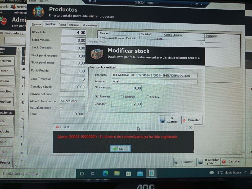 Error al modificar el stock "Ajuste (xxxx-xxxxxxxx): El número de comprobante ya ha sido registrado"
