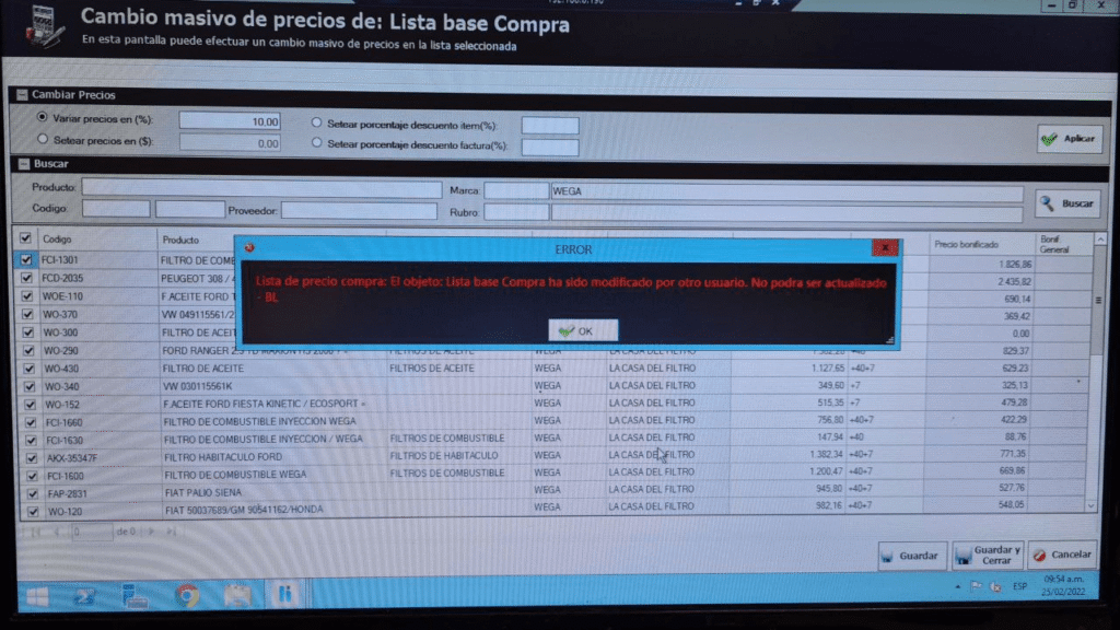 Esto ocurre porque están modificando la lista o alguno de los productos desde otra PC. Los cambios de precios deberá realizarlos fuera de horario en lo posible para evitar esto