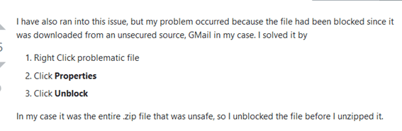 Este error ocurre en raras ocasiones y su origen es al momento de descargar algún archivo el sistema operativo (En el caso de este error fue Windows server) bloquea el archivo descargado, ahora vamos a explicar de que forma poder solucionar esto.