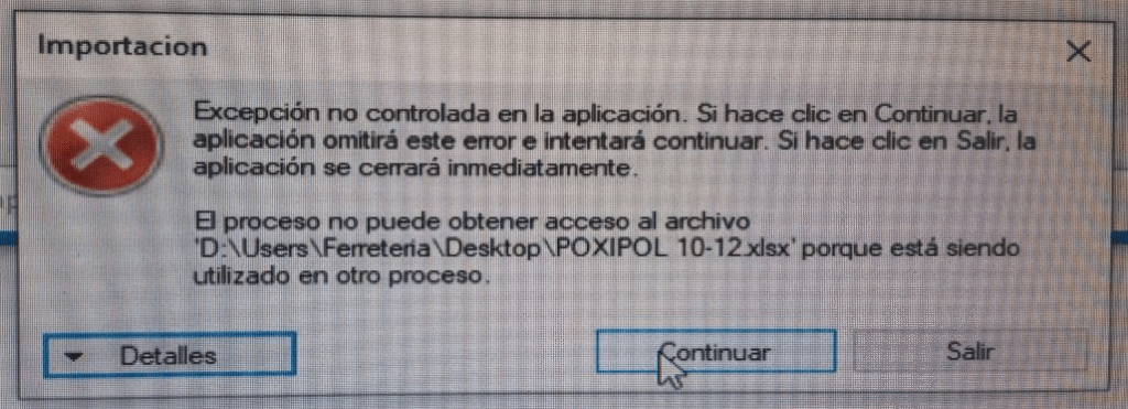 En este caso es porque el archivo que se está tratando de importar se encuentra abierto y no puede ser leído por el sistema hasta que no se cierre el mismo. Podemos buscar el proceso desde el Administrador de Tareas de Windows, reiniciando la PC ó con un desbloqueador como IObit Unlocker