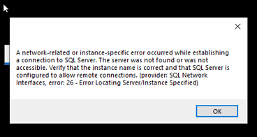 A network-related or instance-specific error ocurred while establishing a connection to SQL Server. The server was not found or was not accesible. Verify that the instance name is correct and that SQL Server is cinfigured to allow remote conections. (provider: SQL Network interfaces, error 26 – Error Locating Server/instance Specified)