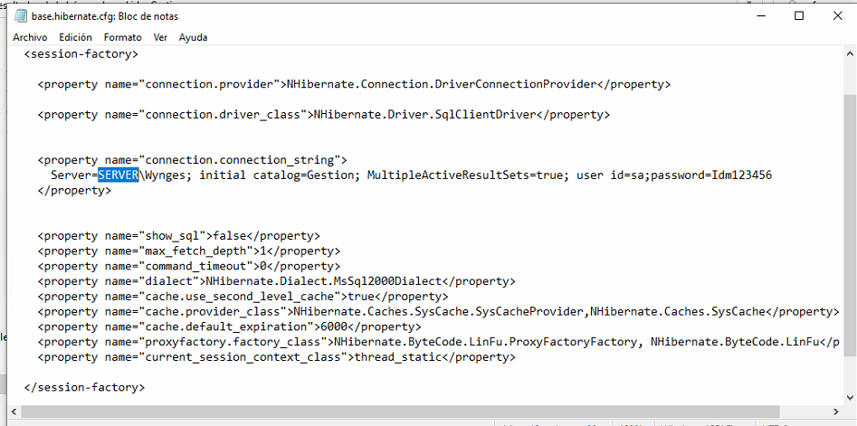 Entre donde dice «Server=» y «Wynges;» iría el nuevo nombre de la PC Server, en este caso «SERVER».
