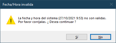 Cuando al iniciar el sistema se muestra el cuadro de error «La fecha y ora del sistema (XX/XX/XXXX XX:XX) no son válidas. Por favor corrijalas. ¿ Desea continuar ?» se puede deber a que la fecha del cierre de caja es superior a la fecha actual.Para corregir esto se deberá ir a Tesorería -> Caja -> Apertura / Cierre de Cajas. Seleccionar la caja y pulsar el botón «Siguiente». Una vez dentro deberá pinchar el botón que se encuentra debajo llamado «Cambiar apertura» y se abrirá una ventana que nos permite cambiar la fecha del saldo inicial, debemos ponerle una que sea anterior a la fecha actual y pulsar «Guardar». Al reiniciar el sistema vemos que el problema se ha solucionado