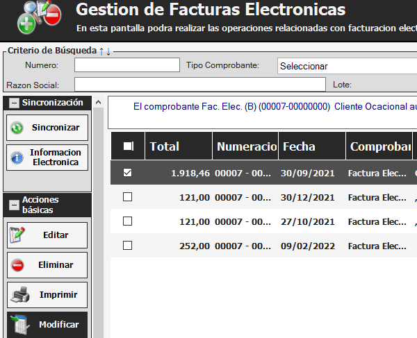 Al finalizar podemos ir a Venta -> Facturación Electrónica -> Gestionar, seleccionamos las facturas que no se sincronizaron y le damos a Modificar. Se abrirá una pantalla en la que le pondremos el nuevo punto de venta, Guardamos y Sincronizamos